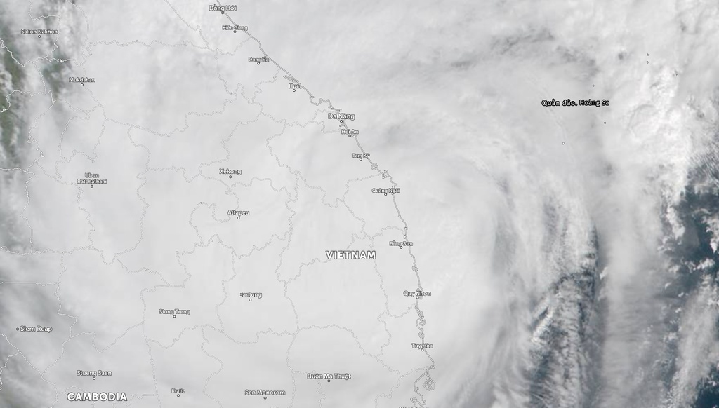 Bức ảnh cho thấy tầm ảnh hưởng của bão số 9. Khu vực từ Bắc Trung Bộ đến Nam Trung Bộ bị phủ bởi các đám mây mưa dày đặc. Người dùng có thể zoom vào từng khu vực để theo dõi bão thời gian thực.