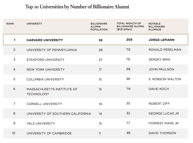 Dẫn đầu là Đại học Harvard với 52 tỷ phú là cựu sinh viên, sở hữu tổng tài sản trị giá 205 tỷ USD. Vị trí thứ là trường đại học Pennsylvania với 28 tỷ phú tốt nghiệp, Đại học Cambridge đứng thứ 10 với 11 cựu sinh viên là tỷ phú.