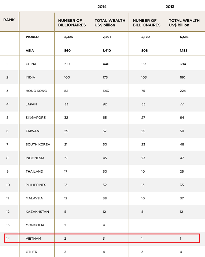 Báo cáo “Billionaire Census 2014” của Wealth-X và UBS (ngân hàng Thụy Sĩ) cho biết, Việt Nam có 2 tỷ phú với tổng tài sản khoảng 3 tỷ USD. Trong báo cáo này năm ngoái, Việt Nam chỉ có một đại diện duy nhất với quy mô tài sản 1 tỷ USD.