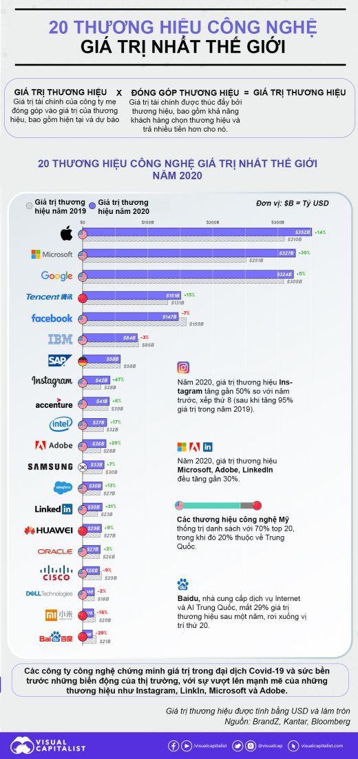 Các thương hiệu công nghệ đã chứng minh được giá trị của mình giữa đại dịch và sức bền trước những biến động của thị trường. Dưới đây là xếp hạng 20 thương hiệu công nghệ giá trị nhất thế giới năm 2020, được đưa ra dựa trên phỏng vấn 3,8 triệu khách hàng và dữ liệu tài chính của 17.801 thương hiệu tại 51 thị trường.