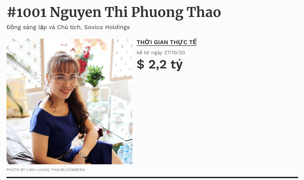 Nữ tỷ phú duy nhất của Việt Nam Nguyễn Thị Phương Thảo cũng là đại diện ghi nhận khối tài sản tăng lên so với giai đoạn cao điểm COVID-19. Hồi tháng 4/2020, bà Phương Thảo nắm trong tay 2,1 tỷ USD. Đến nay, con số này được nhích lên 2,2 tỷ USD. Bà chủ Vietjet Air đang đứng thứ 1.274 trong bảng xếp hạng tỷ phú thế giới của Forbes.
