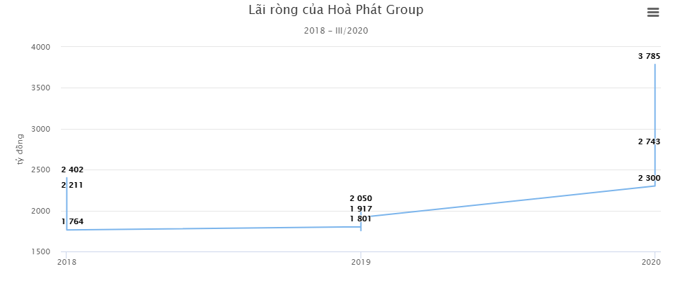 Thị giá cổ phiếu là phản ánh tốt nhất cho báo cáo tài chính quý III/2020 vừa công bố. Trong quý, Hòa Phát đạt 24.900 tỷ đồng doanh thu, tăng 62,7% và 3.785 tỷ đồng lợi nhuận sau thuế, gấp hơn 2 lần so với cùng kỳ năm trước. Với mức lợi nhuận này, Hòa Phát đã lập kỷ lục về lợi nhuận sau thuế trong một quý.
