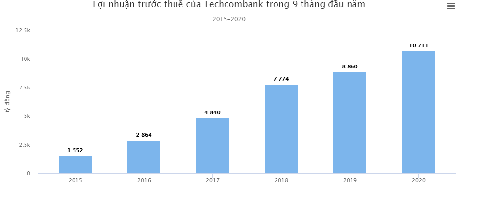 Mới đây, Techcombank đã công bố báo cáo tài chính quý III/2020. Theo đó, luỹ kế 9 tháng đầu năm, hầu hết hoạt động kinh doanh của nhà băng này vẫn tăng trưởng và ghi nhận 19.280 tỷ đồng tổng doanh thu hoạt động, tăng 34%. Lợi nhuận trước thuế của Techcombank tăng 21%, đạt 10.711 tỷ đồng. Đây cũng là con số lợi nhuận 9 tháng cao kỷ lục mà nhà băng này từng ghi nhận được.