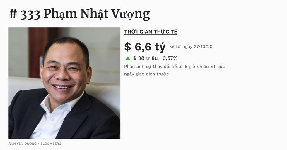 Tuy khối lượng tài sản tăng lên nhưng thứ hạng của tỷ phú Phạm Nhật Vượng lại giảm. Hồi tháng 4, ông đứng thứ 286 trên bảng xếp hạng tỷ phú thế giới của Forbes. Đến nay, bạn đọc phải lướt chuột xuống dòng thứ 334 mới tìm thấy tên ông, tức tuột mất 48 hạng chỉ sau 6 tháng.