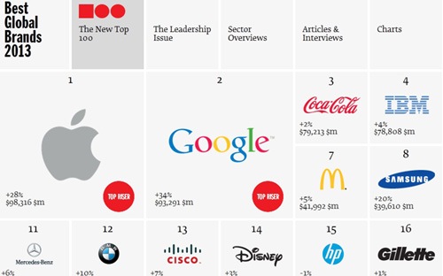 Cụ thể, theo Interbrand, giá trị thương hiệu của Apple hiện vào khoảng 98,3 tỷ USD, dẫn đầu thế giới. "Người khổng lồ" tìm kiếm trực tuyến Google đứng thứ hai với giá trị thương hiệu là 93,29 tỷ USD. Với sự vươn lên của Apple và Google, thương hiệu nước giải khát Coca-Cola, từng độc chiếm vị trí số một trong nhiều năm qua, đã bị đẩy xuống vị trí thứ ba, với 79,2 tỷ USD.