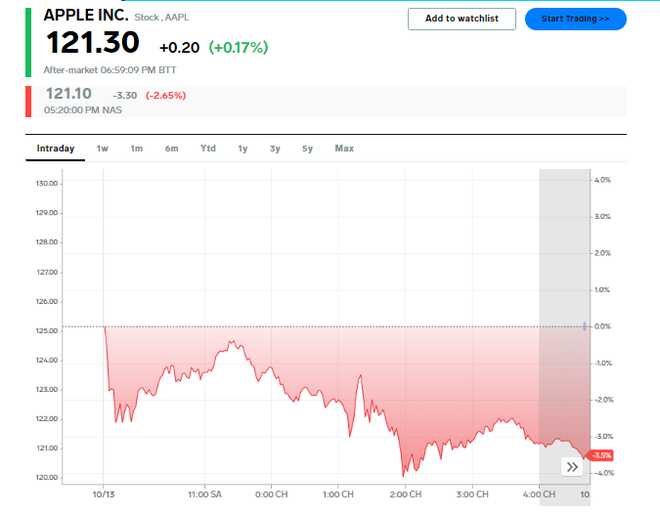 Tính đến chiều ngày 13/10 theo giờ Mỹ, cổ phiếu của Apple giữ ở mức 121,30 USD/cổ phiếu, giảm khoảng 3,5% so với thời điểm chưa ra mắt iPhone 12.