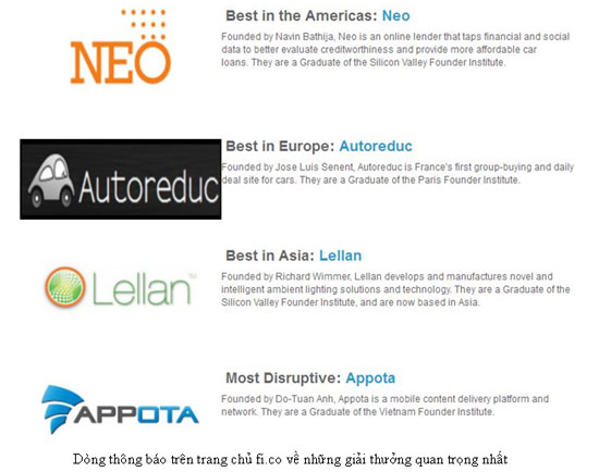 30/07/2012 4:23 PMTheo thông báo chính thức của tổ chức Founder Institute, Appota của doanh nhân trẻ Đỗ Tuấn Anh đã trở thành đại diện duy nhất của Việt Nam và 1 trong 3 đại diện của châu Á tham gia Founder Showcase tại Mountain View- California- Mỹ. Bất ngờ hơn nữa, theo thông báo mới nhất từ trang FI.co- Appota đã giành giải “dự án đột phá nhất”.