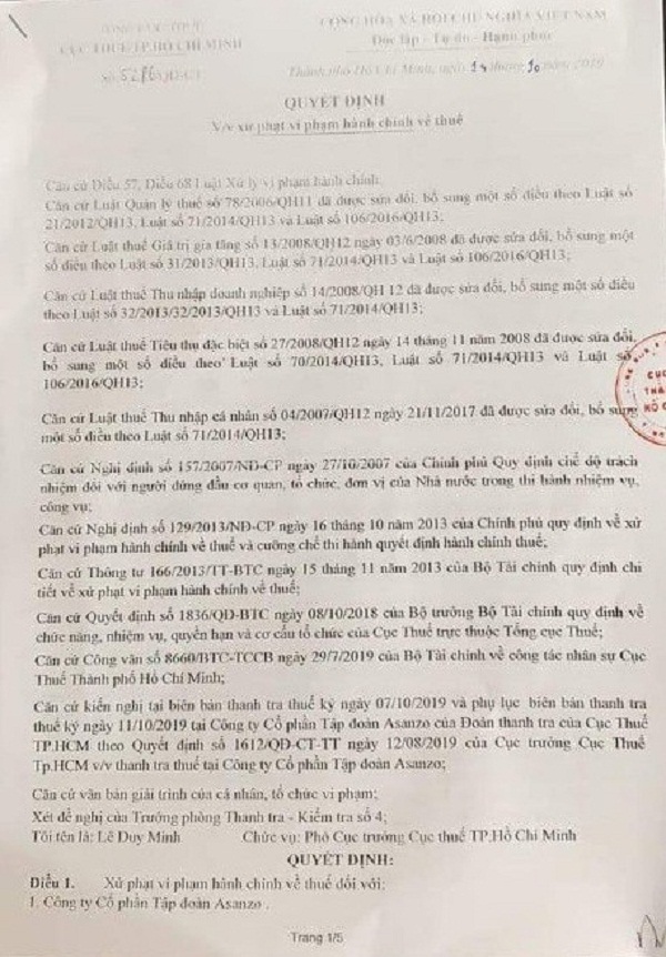 Quyết định xử phạt hành chính về thuế đối với Công ty cổ phần tập đoàn Asanzo của Cục Thuế TP.HCM