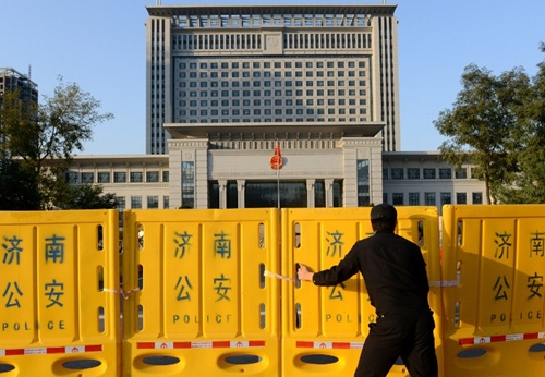 An ninh thắt chặt xung quanh tòa án ở thành phố Tế Nam với hàng chục sĩ quan cảnh sát hôm qua đóng quân tại đây, và những cửa hàng gần đó được lệnh đóng cửa vào hôm nay.