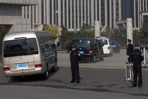 Đoàn xe được cho là chở ông Bạc sáng nay đi vào Tòa án Cấp cao tỉnh Sơn Đông, miền đông Trung Quốc. Ảnh: AP