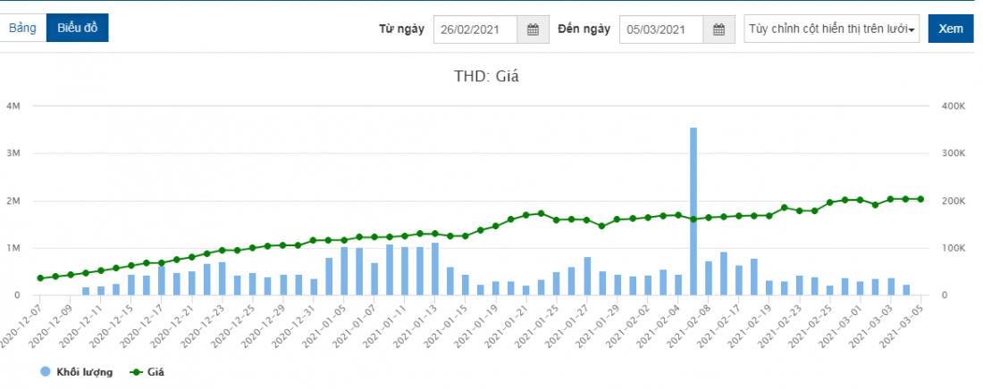 Cổ phiếu này sau đó tạo ra kỷ lục 18 phiên tăng liên tiếp với 17 phiên tăng trần lên mức 95.000 đồng/cổ phiếu. Đầu tháng 12/2020, cổ phiếu chạm ngưỡng 201.000 đồng/cổ phiếu. Mở đầu phiên giao dịch ngày 5-3-2021, giá cổ phiếu THD đang dao động quanh mức 203.200 đồng/cổ phiếu.