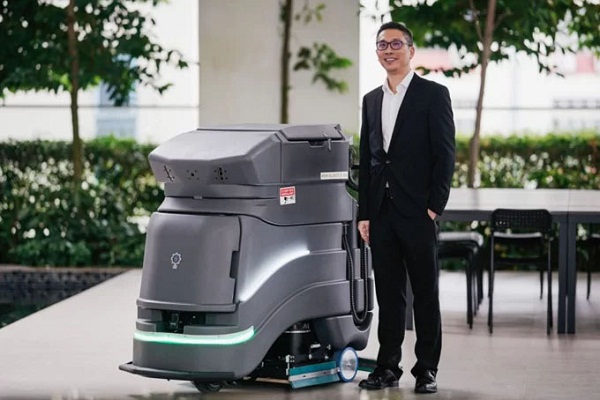 Vernon Kwek đứng cạnh thiết bị vệ sinh của công ty Primech. Ảnh: Straitstimes.