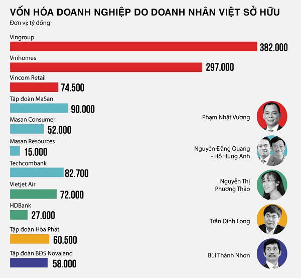 Nhiều doanh nhân khác cũng đang sở hữu doanh nghiệp vốn hóa hàng tỷ USD như Tập đoàn Hòa Phát (60.500 tỷ đồng) của ông Trần Đình Long; Tập đoàn bất động sản Novaland (58.000 tỷ đồng) của ông Bùi Thành Nhơn; Thế giới Di động (54.500 tỷ đồng) của ông Nguyễn Đức Tài…