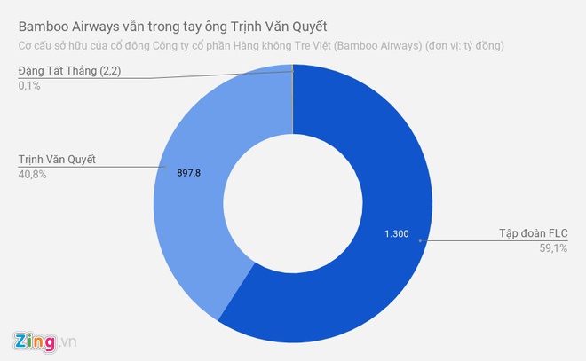 Như vậy, ông Trịnh Văn Quyết nắm trực tiếp tới 40,8% cổ phần của hãng bay. Bên cạnh đó, ông cũng có quyền chi phối không nhỏ với 59% cổ phần hãng bay do Tập đoàn FLC nắm giữ do ông là cổ đông lớn và là Chủ tịch của doanh nghiệp này.