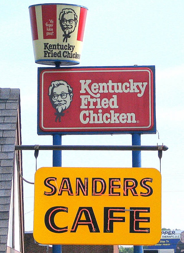 Biển hiệu KFC và Sanders Cafe tại nhà hàng của Sanders ở Corbin, Kentucky, nơi Sanders bắt đầu phát triển món gà rán nổi tiếng của mình. Ảnh: Flickr.