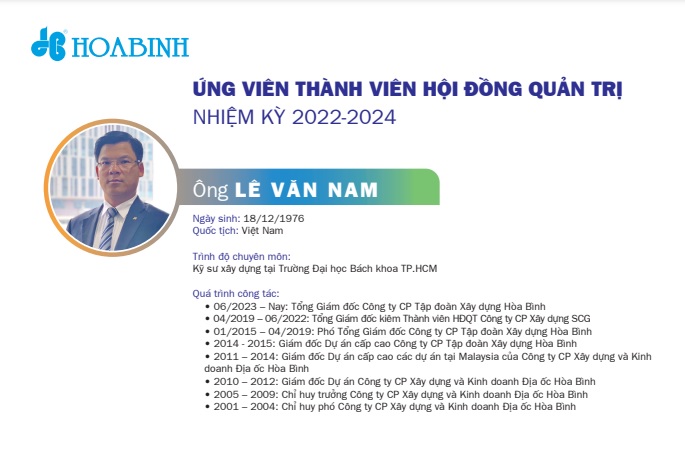 Nếu ông Nam và ông Thung trúng cử, HĐQT Hòa Bình sẽ có 8 thành viên, gồm hai thành viên mới và 4 thành viên cũ là ông Lê Viết Hải - Chủ tịch, ông Lê Viết Hiếu - Phó Chủ tịch, ông Nguyễn Tường Bảo và ông Dương Văn Hùng - hai Thành viên độc lập.