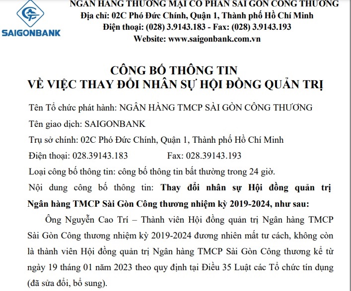 Trong lĩnh vực ngân hàng, đầu năm 2023, Ngân hàng TMCP Sài Gòn Công Thương (Saigonbank) đã công bố thông tin bất thường cho biết ông Nguyễn Cao Trí không còn là thành viên Hội đồng quản trị SaigonBank nhiệm kỳ 2019-2024 kể từ ngày 19/1. Văn bản không nêu lý do nhưng cho biết ông Trí "đương nhiên mất tư cách", không còn là thành viên Hội đồng quản trị theo quy định tại Điều 35 Luật các Tổ chức tín dụng (đã sửa đổi, bổ sung).