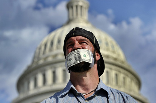 Một người đàn ông, với tờ tiền một USD gắn trên miệng, đứng trước Tòa nhà Quốc hội Mỹ hôm 3/10. |