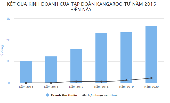 Tính chung cả năm 2020, Kangaroo đạt 2.663 tỷ đồng tổng doanh thu thuần, tăng 12% so với năm 2019. Dẫu vậy, lợi nhuận sau thuế vẫn tăng gấp đôi năm ngoái, đạt 224 tỷ đồng. Trung bình mỗi ngày hãng sở hữu thương hiệu máy lọc nước Kangaroo lãi 614 triệu đồng.