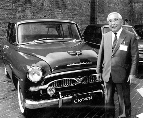 | Eiji Toyoda bên chiếc Toyota Crown thế hệ đầu tại bảo tàng của Toyota năm 1995. Ảnh: Asahi Shimbun |