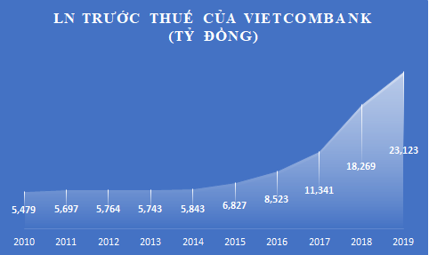 Xét về con số tăng trưởng, tăng trưởng lợi nhuận trước thuế bình quân giai đoạn 2010 - 2019 của Vietcombank ở mức 32%/năm. Sau một thời gian từ 2010 - 2015 "đi ngang" không mấy bứt phá để dành nguồn lực xử lý gọn nợ xấu, lợi nhuận của Vietcombank bắt đầu đi lên mạnh mẽ từ năm 2016, lấy lại ngôi vương lợi nhuận và duy trì suốt từ đó tới nay với khoảng cách ngày càng xa so với nhóm phía sau. Tính đến cuối năm 2019, lợi nhuận trước thuế của một số ngân hàng cộng lại vẫn chưa bằng con số 1 tỷ USD lợi nhuận trước thuế mà Vietconbank có được trong năm 2019.