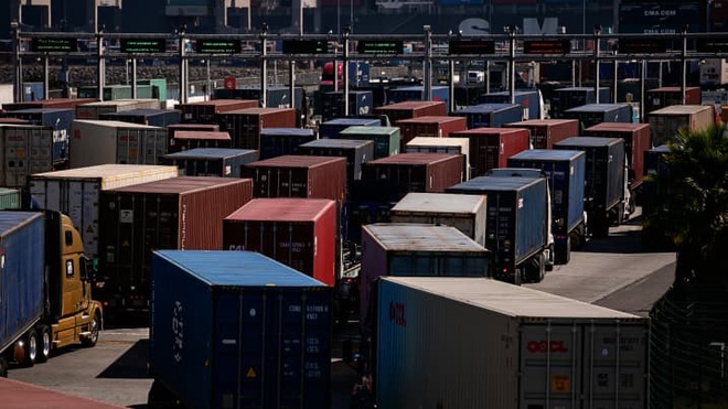 Các đoàn xe tải chở hàng ùn tắc ở cảng Los Angeles California (Ảnh: Bloomberg).