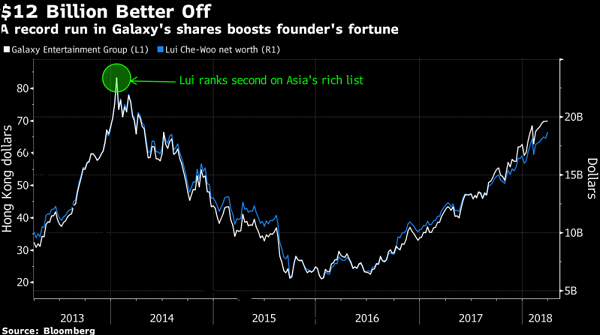 Giá cổ phiếu của đế chế sòng bạc hàng đầu Macau - Galaxy Entertainment Group Ltd đã tăng gần gấp 3 lần kể từ tháng 6/2016, mang về cho nhà sáng lập Lui Che-Woo 12 tỷ USD.
