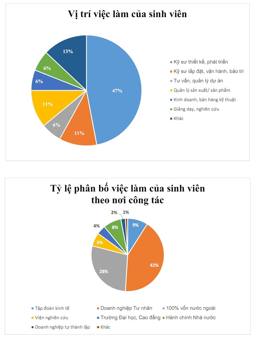 Kết quả khảo sát vị trí việc làm cho thấy, có 47% sinh viên làm kỹ sư thiết kế, phát triển; 11% kỹ sư lắp đặt, vận hành, bảo trì; 6% làm về tư vấn, quản lý dự án; 11% là quản lý sản xuất, sản phẩm; 6% làm kinh doanh, bán hàng kỹ thuật; 6% làm công tác giảng dạy, nghiên cứu và 13% làm ở các vị trí công việc khác.