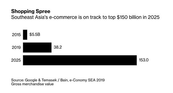 Thị trường thương mại điện tử Đông Nam Á dự kiến đạt quy mô 38,2 tỷ USD trong năm 2019 và 153 tỷ USD vào năm 2025. Ảnh: Bloomberg.