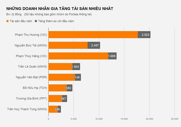 Người có mức tăng tài sản lớn nhất là ông Phạm Nhật Vượng - Chủ tịch Tập đoàn Vingroup với 7,8 tỷ USD, thêm 1,2 tỷ USD so với thống kê hồi đầu năm.