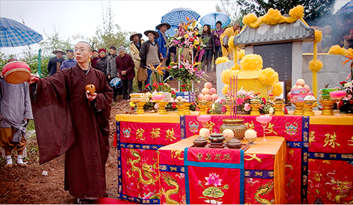 Người Trung Quốc có tập tục mai táng rất kỹ lưỡng, từ địa điểm xây mộ, trang điểm cho người quá cố đến các bước tang lễ. Họ quan niệm những điều này sẽ mang lại may mắn cho người sống. Lễ tưởng niệm có thể kéo dài trong nhiều ngày, thức ăn, đồ uống, tiền âm phủ, hay thậm chí cả iPad, túi xách Chanel và biệt thự cũng được đốt theo để người âm có cuộc sống thoải mái.