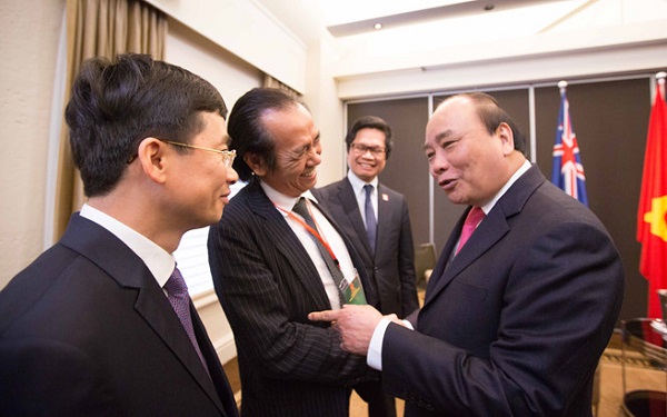 Thủ tướng Nguyễn Xuân Phúc trao đổi với doanh nhân Nguyễn Ngọc Mỹ (bắt tay đứng giữa).