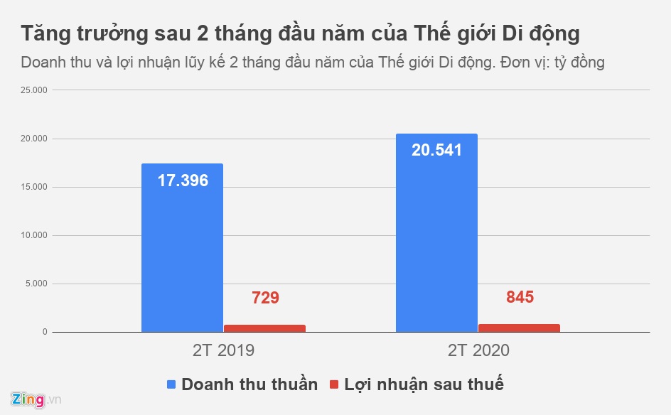 Báo cáo cập nhật kết quả kinh doanh 2 tháng đầu năm của Thế giới Di động cho biết tập đoàn này đạt doanh thu thuần 20.541 tỷ đồng và lợi nhuận 845 tỷ đồng lũy kế. Doanh thu tăng 18% và lợi nhuận tăng 16% so với cùng kỳ 2019.