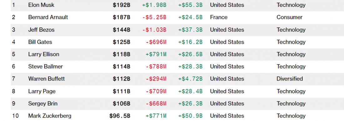 Với giá trị tài sản ròng khoảng 192 tỷ USD, tỷ phú công nghệ Elon Musk hiện đang là người giàu nhất thế giới và người đứng thứ hai là Bernard Arnault với tổng tài sản 186 tỉ USD, mất khoảng 114 tỉ USD kể từ tháng 3/2023.