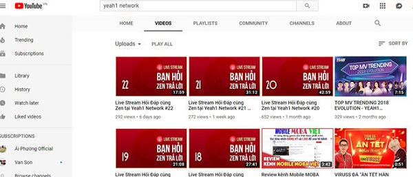 Một số kênh thuộc Yeah1 Network trên YouTube. Ảnh chụp màn hình
