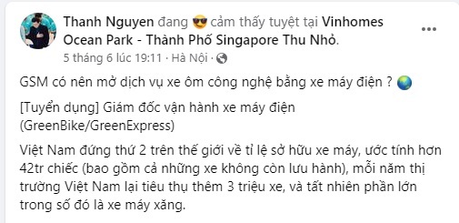 Theo đó, vị CEO trẻ tuổi của Công ty Cổ phần di chuyển Xanh và Thông minh (GSM) đã tăng tải một bài viết gợi mở việc GMS có nên mở dịch vụ xe ôm công nghệ bằng xe máy điện? Đồng thời tuyển dụng vị trí Giám đốc vận hành xe máy điện (GreenBike/GreenExpress).