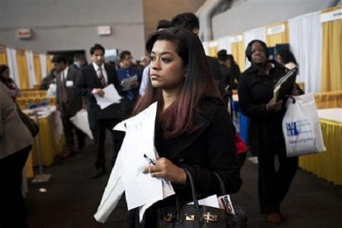 Một nhân viên cấp cao trong ngành viễn thông chờ để gặp nhà tuyển dụng tại Hội chợ việc làm và thực tập Big Apple năm 2012 ở thành phố New York (Mỹ) - Ảnh: Reuters