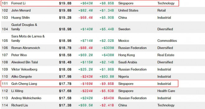 06/09/2021 9:35 PMSở hữu khối tài sản trị giá 19,8 tỷ USD, chủ tịch Forrest Li vượt mặt doanh nhân Goh Cheng Liang để trở thành người giàu nhất đảo quốc sư tử.