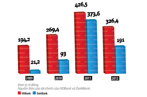 Dù có quy mô nhỏ hơn nhưng DaiABank đã sớm đáp ứng yêu cầu an toàn tài chính của Ngân hàng Nhà nước, tăng vốn điều lệ lên 3.000 tỉ đồng năm 2010 trong khi HDBank đi sau 1 năm. Vốn chủ sở hữu của HDBank hiện khoảng 5.400 tỉ đồng, lớn hơn DaiABank 30%. Dù vậy, cơ cấu tài chính và hiệu quả hoạt động của hai ngân hàng này có nhiều điểm tương đương. HDBank và DaiABank đều thu được mức lợi nhuận vừa phải trong bối cảnh một số ngân hàng hầu như không còn vốn sau khi trích lập dự phòng nợ xấu. Lợi nhuận ròng năm 2012 của DaiABank là 191 tỉ đồng và HDBank hơn 326 tỉ đồng. Nếu xét hệ số ROE (lợi nhuận/vốn chủ sở hữu), hai bên không quá chênh lệch (DaiABank 5,7% và HDBank 6%). Hệ số P/E (giá/lợi nhuận mỗi cổ phần) cũng ngang nhau, tương đương 6 lần.