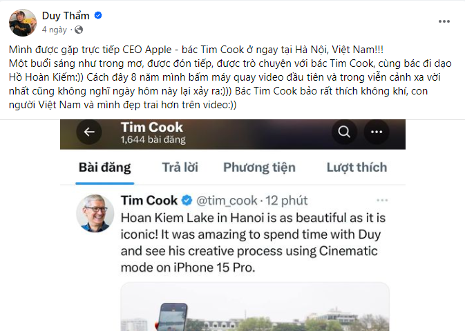 20/04/2024 9:43 AMTrong buổi giao lưu tại Hồ Hoàn Kiếm của CEO Tim Cook cùng một số nhà sáng tạo nội dung Việt Nam, một gương mặt đáng chú ý được trực tiếp trò chuyện cùng CEO Apple là Youtuber, Reviewer Duy Thẩm.