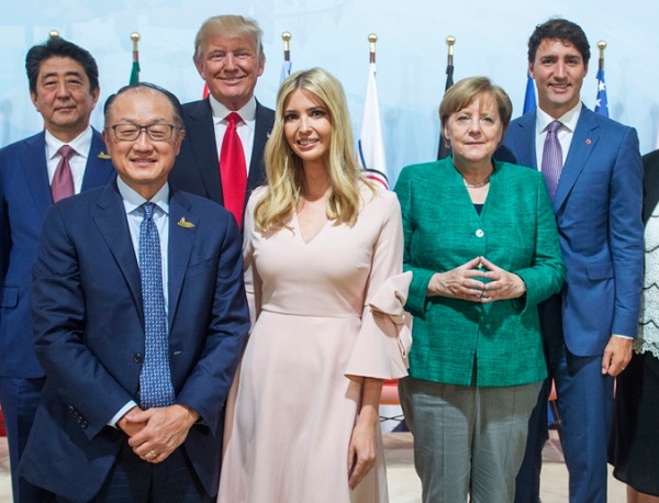 Ivanka Trump gây tranh cãi khi đứng ngang hàng các lãnh đạo quốc gia tại hội nghị thượng đỉnh G20 tháng 7/2017. Ảnh: AP.