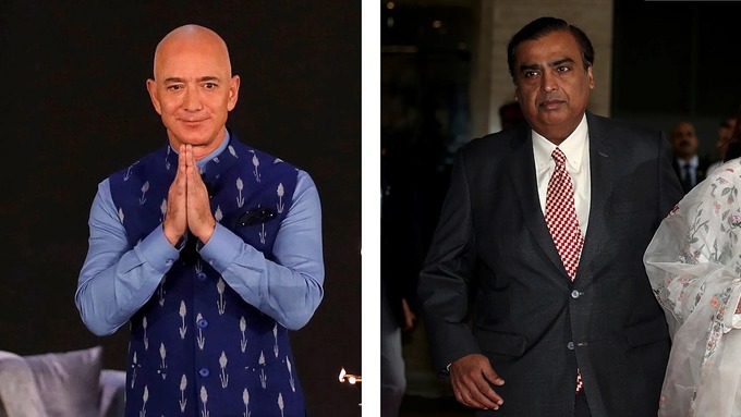 Tỷ phú Jeff Bezos (bên trái) và tỷ phú Mukesh Ambani. Ảnh: Reuters.