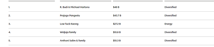 Với giá trị tài sản ròng giảm xuống chỉ còn 42,1 tỉ trong ngày 9/1, Prajogo Pangestu chính thức bị soán ngôi vị trí người giàu nhất Indonesia bởi anh em nhà tỉ phú R. Budi & Michael Hartono.