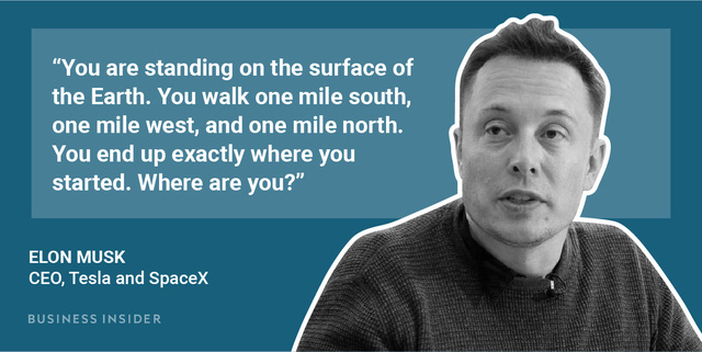 Theo cuốn "Elon Musk: Tesla, SpaceX, and the Quest for a Fantastic Future", Elon Musk hỏi câu hỏi trên để thử trí thông minh của những người ứng tuyển. Và câu trả lời có nhiều hơn một đáp án, một trong số đó là Bắc Cực.