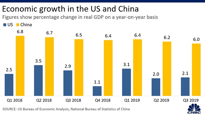 GDP giảm: Tăng trưởng GDP - thước đo rộng nhất của một nền kinh tế - chậm lại ở cả Mỹ và Trung Quốc vào năm 2019. Đỉnh điểm vào đầu năm 2019, Mỹ chỉ đạt tỷ lệ tăng trưởng 1,1%; trong khi con số này vào đầu năm 2018 là 2,5%. Trung Quốc cũng chứng khiến tình trạng giảm sút nhưng chưa quá 1%.