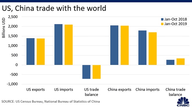 Tuy nhiên, thâm hụt thương mại của Mỹ với Trung Quốc vẫn tiếp diễn, dù đã giảm từ 344,5 tỷ USD trong khoảng thời gian từ tháng 1-10/2018 xuống còn 294,5 tỷ USD vào năm 2019. Ảnh: Straits Times.