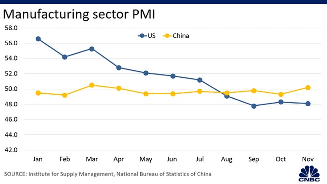 Sản xuất suy thoái: Khu vực sản xuất của Mỹ và Trung Quốc đều suy giảm do chiến tranh thương mại. Chỉ số quản lý thu mua (PMI) - chỉ số đánh giá sức khỏe của ngành sản xuất - co lại ở Trung Quốc trong năm qua, ở dưới mức 50 điểm. PMI Mỹ cũng giảm từ tháng 8.