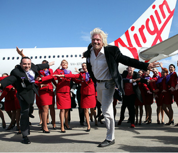 Tỷ phú Richard Branson cùng các nhân viên hãng hàng không Virgin Atlantic.