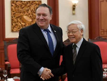 Tổng bí thư Nguyễn Phú Trọng bắt tay Ngoại trưởng Mỹ Mike Pompeo trong chuyến thăm của ông Pompeo tới Việt Nam hồi tháng 7/2018 (Ảnh: Reuters)