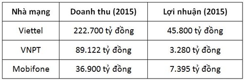 Năm 2015, doanh thu của 3 nhà mạng lớn ở Việt Nam là Viettel, Vinaphone và Mobifone đều tăng mạnh. Thông tin từ Viettel cho thấy, tập đoàn này đạt 222.700 tỷ đồng doanh thu, tăng 13% so với năm 2014 và lợi nhuận đạt 45.800 tỷ đồng, tăng trưởng 8,5%. Tương tự, doanh thu của VNPT - Vinaphone và Mobifone lần lượt là 89.122 tỷ đồng và 36.900 tỷ đồng.